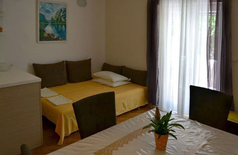 | Stručné informace: | | | Vzdálenost od moře | 50 m | | Vzdálenost od pláže | 50 m | | Typ pláže | písčitá | | Vzdálenost od centra | 300 m | | Nejbližší obchod | 50 m | | Nejbližší restaurace | 500 m | | Objekt disponuje: | | | TV/SAT | ano | | Klimatizace | ano, 5 € / den | | Internet | ano, zdarma | | Povlečení | ano, 1 x za pobyt | | Ručníky | ano, 1 x za pobyt | | Taoletní papír | ano, 1 x za pobyt | | APP 2+2 ´1L´ (201010301) Umístění: Přízemí Počet místností: 2 Počet osob: max. 4 | | Ložnice: manželská postel, skříň | | Obývací pokoj s kuchyňským koutem: pohovka na rozložení pro 1 osobu, TV/SAT, klimatizace | | Kuchyňské vybavení: plynový i elektrický sporák, trouba, lednička s mrazákem, rychlovarná konvice, stůl, 4x židle | | Koupelna: sprchový kout, WC | | Terasa: posezení pro 4 osoby, sušák na prádlo, markýza Výhled: zahrada | | Klimatizace: ano (5 € / den) Internet: ano (zdarma)