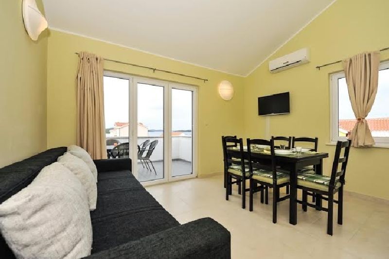 | APP 2+2 "9" (103101309) Umístění: 2. patro Počet místností: 2 Počet osob: max. 4 | | Ložnice: manželská postel, skříň | | Obývací pokoj s kuchyňským koutem: pohovka na rozložení pro 2 osoby, LCDTV/SAT, klimatizace | | Kuchyňské vybavení: elektrický sporák, trouba, lednička s mrazákem, mikrovlnka, stůl, 4x židle | | Koupelna: sprchový kout, WC | | Terasa: posezení pro 4 osoby Výhled na moře: ano | | Klimatizace: ano (zdarma) Internet: ano (zdarma)